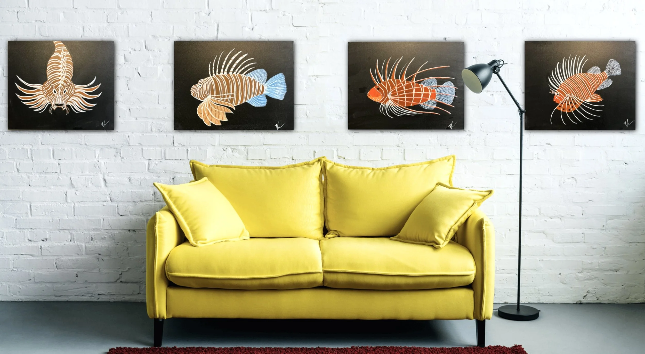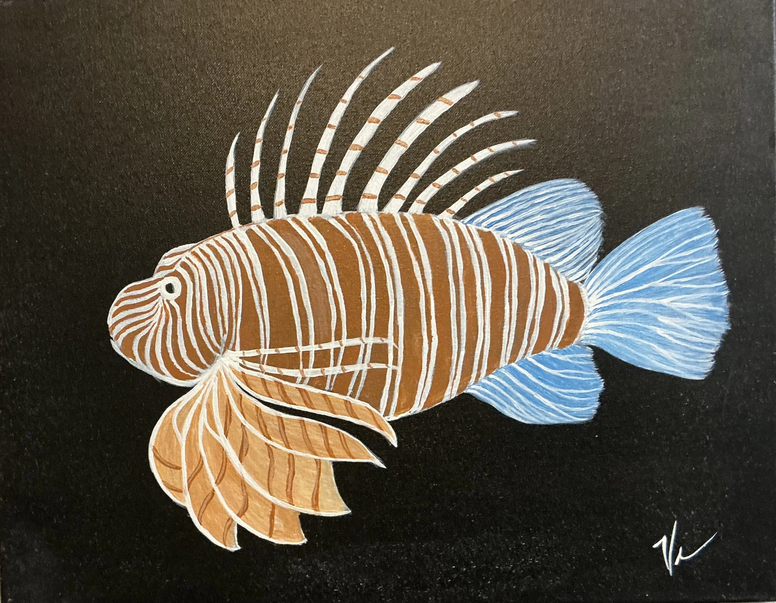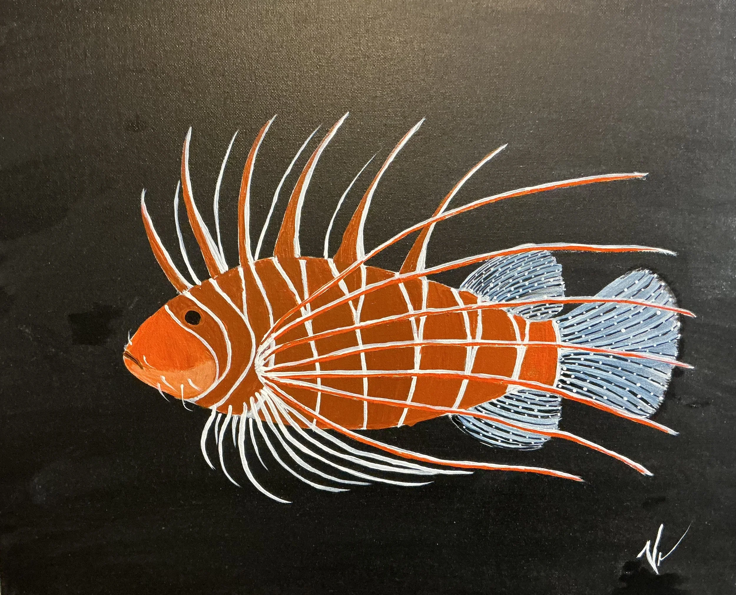 My Lionfish series measuring 16 x 20“ created using acrylic, this painting series is designed captivate, the mystique of the Lionfish. IInspired by the Florida Keys Lionfish derby, this series invites you to admire its beauty and splendor. While recognizing its uniqueness of being dangerous to our Florida natural species. The art captures both beauty and danger of this fascinating fish.