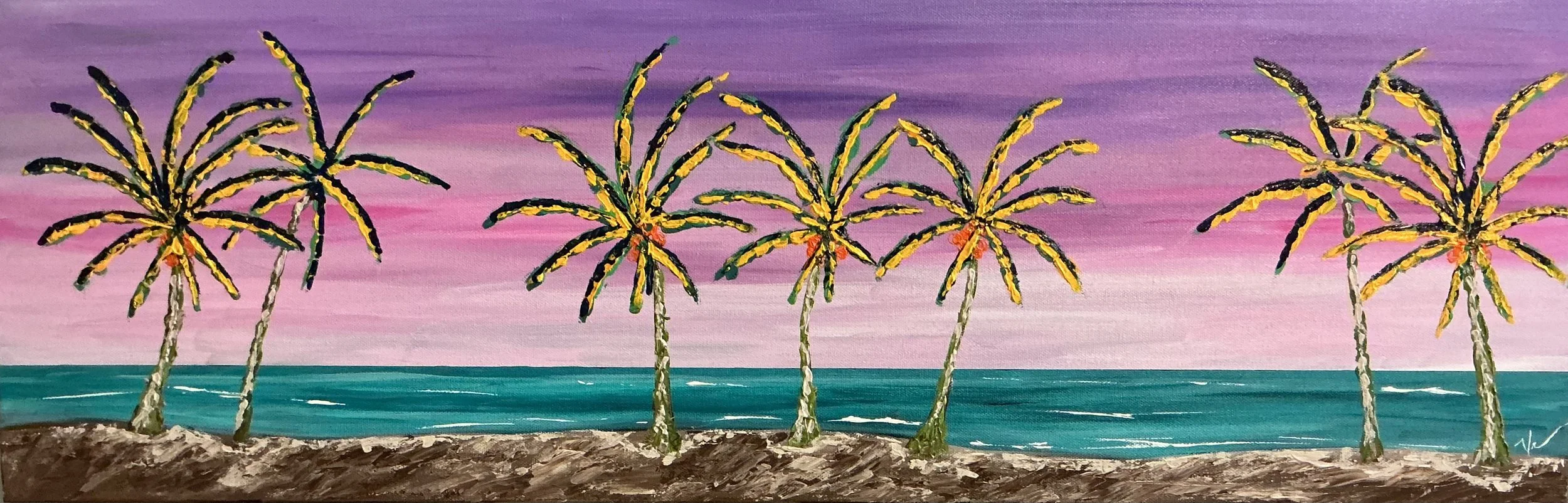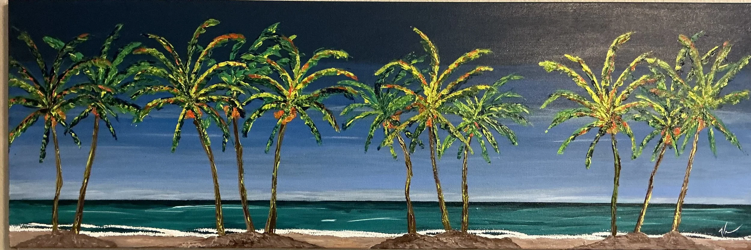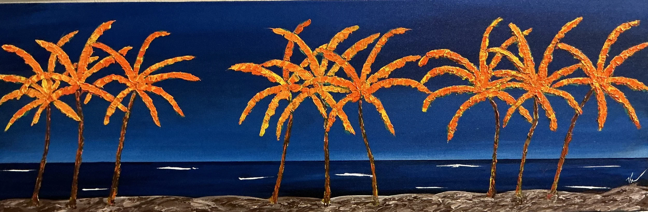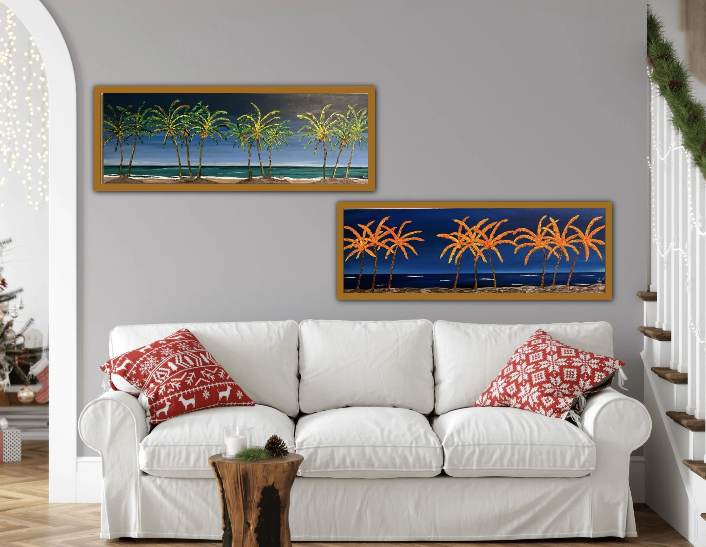 This Ocean Edge “ Coconut Palms Tree series embodies the essence of tropical paradise. This set of knife painting’s in acrylic’s on a 12x36 canvas captures the tranquil beauty of Florida’s beaches, framed by a delightful line of coconut palms trees standing gracefully on the shore.